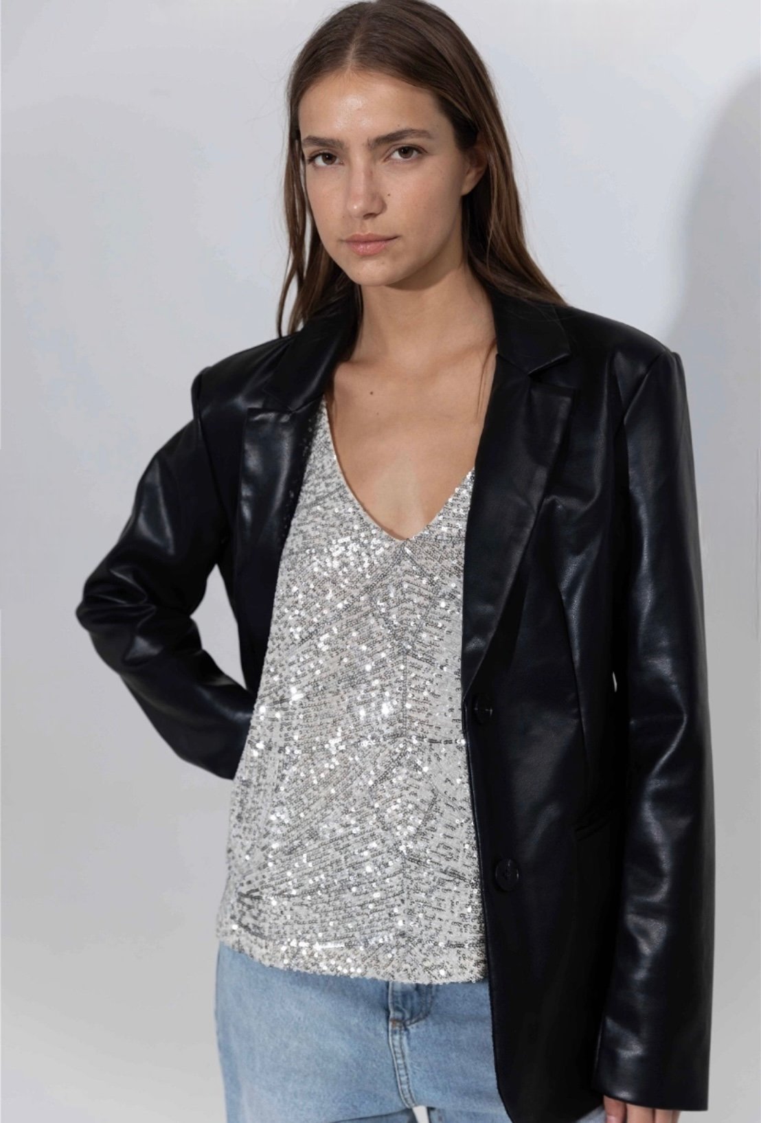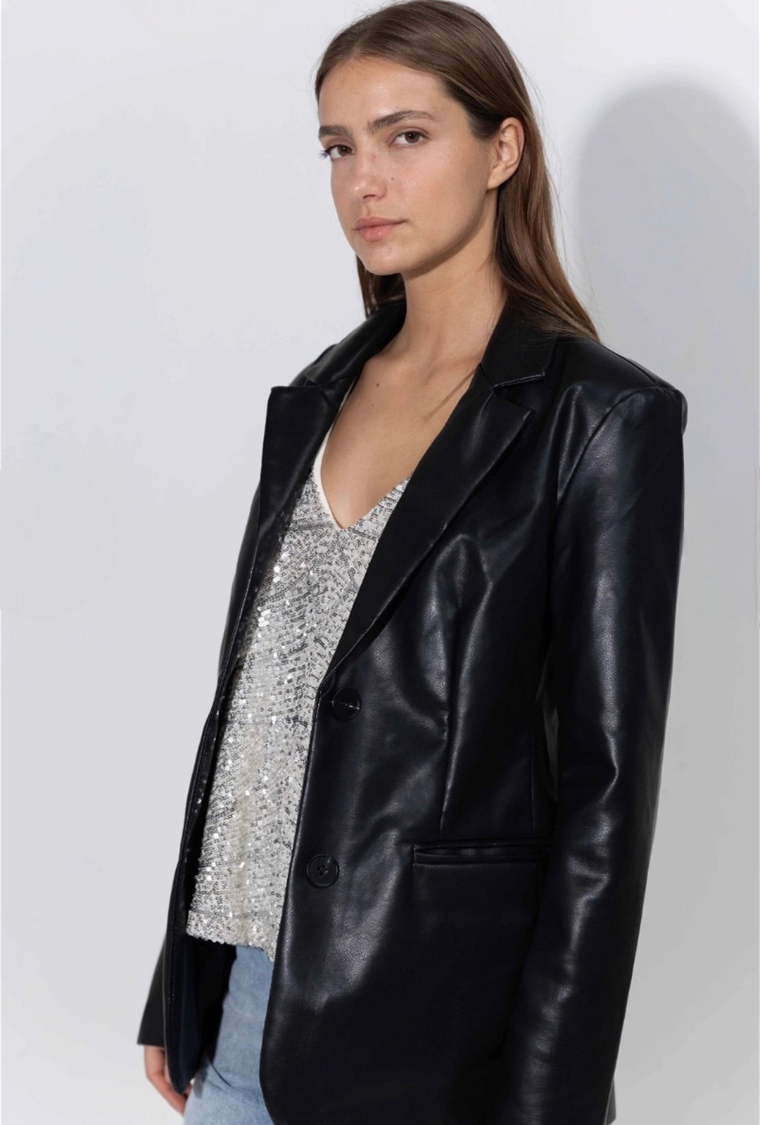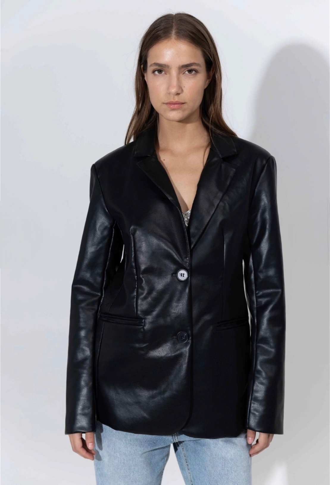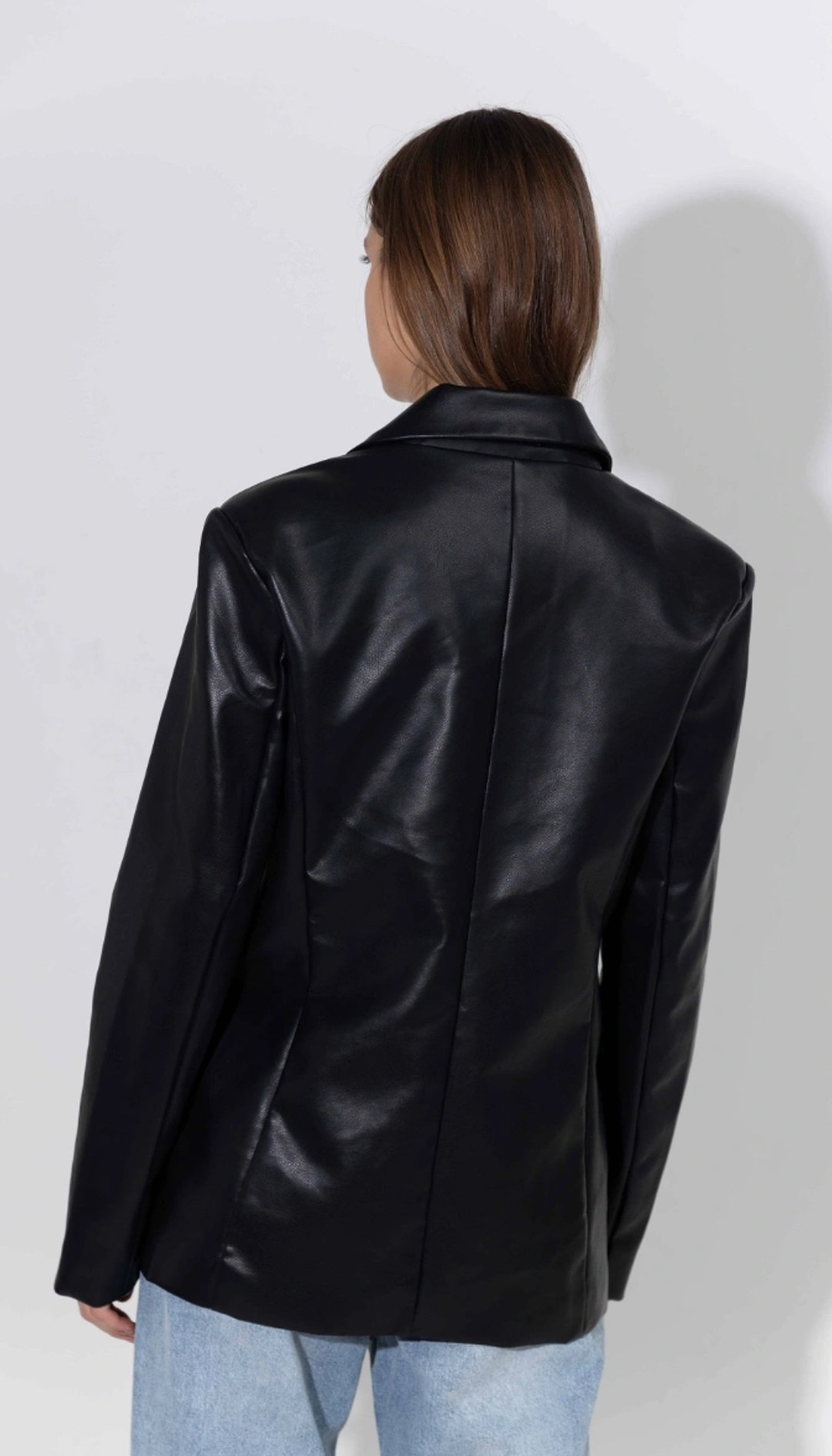 Chaqueta de cuero pu, con bolsillos solapados en laterales. Marca: INÉDITA