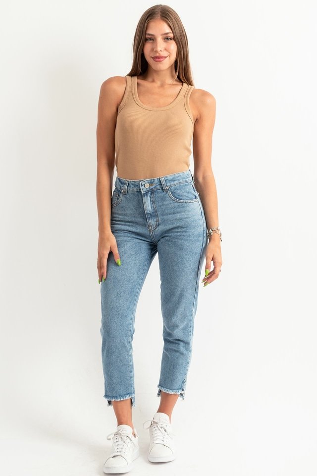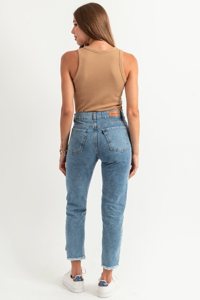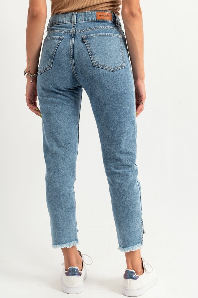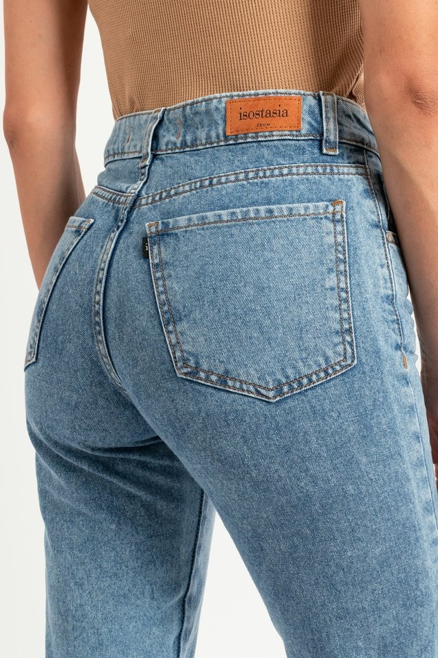 Jeans Mom Fit con Bigotes tiro alto, bota desigual