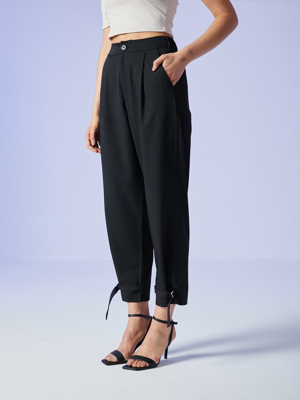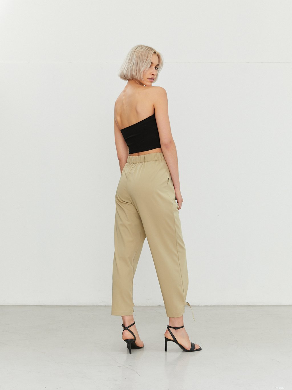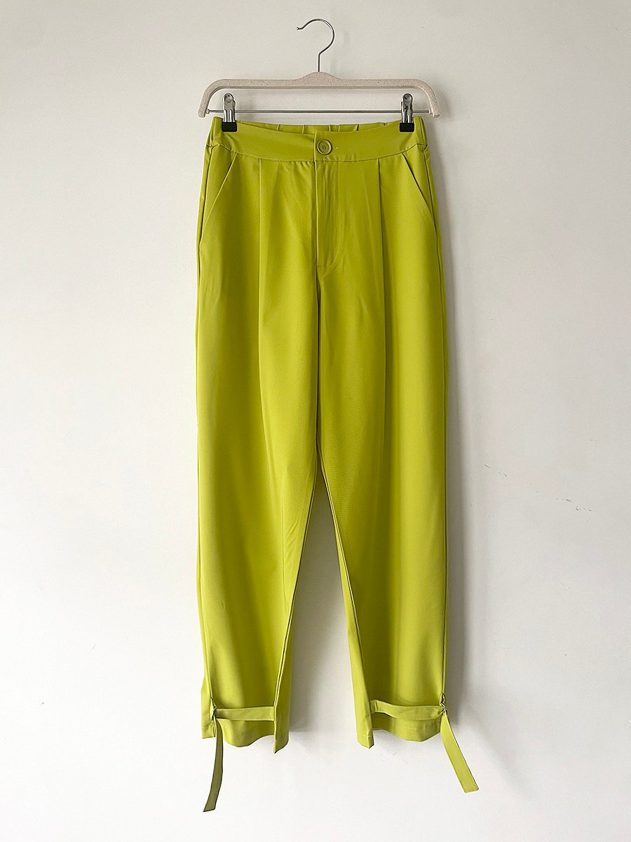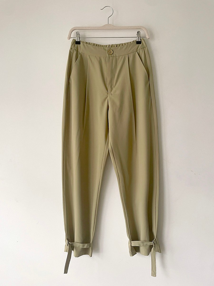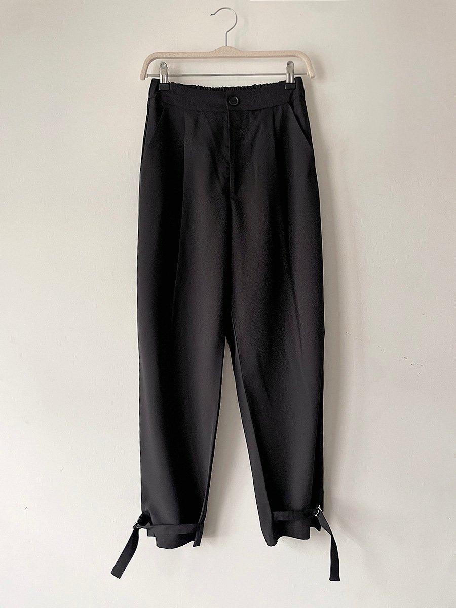 Pantalón recto con cierre y botón frontal. Cintura elástica en la espalda. Bolsillos y pinza delantera. Presillas regulables en la botamanga