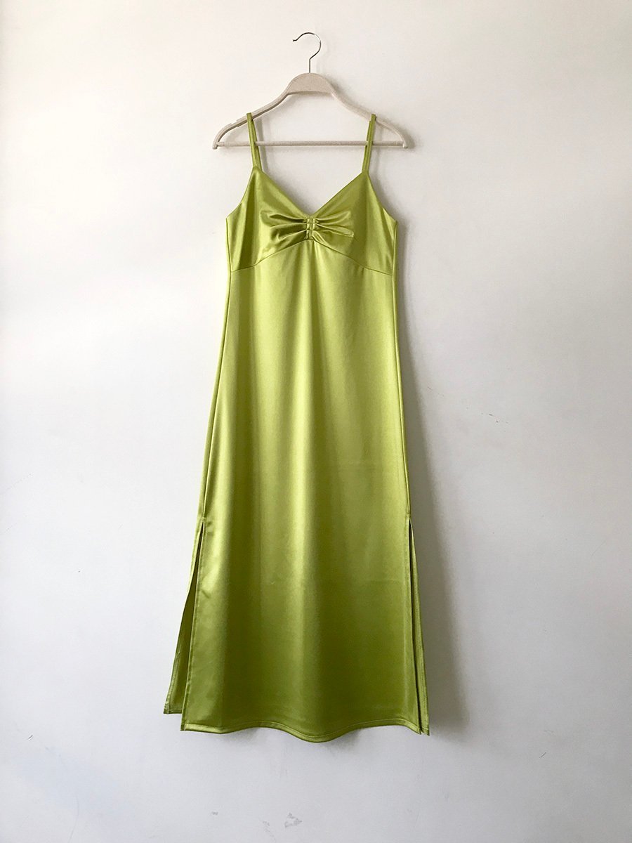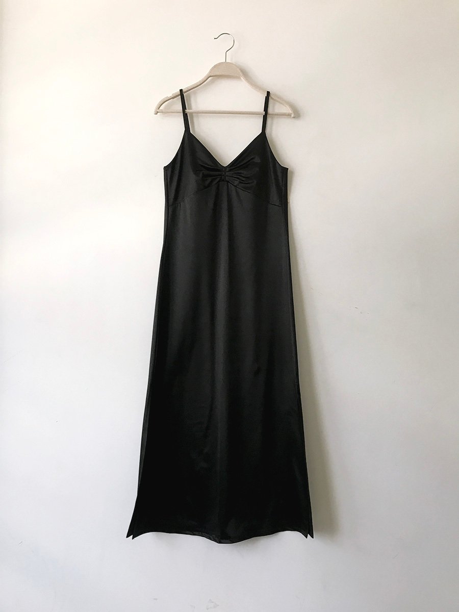 Vestido largo de bretel fino, con recorte delantero y tablas en el busto